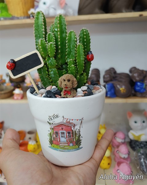 Tên sản phẩm: Chậu ly xương rồng mix tiểu cảnh chú chó mini và bảng gỗ mini